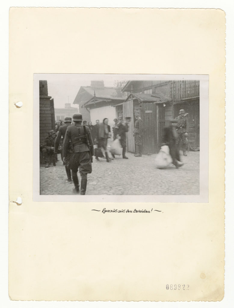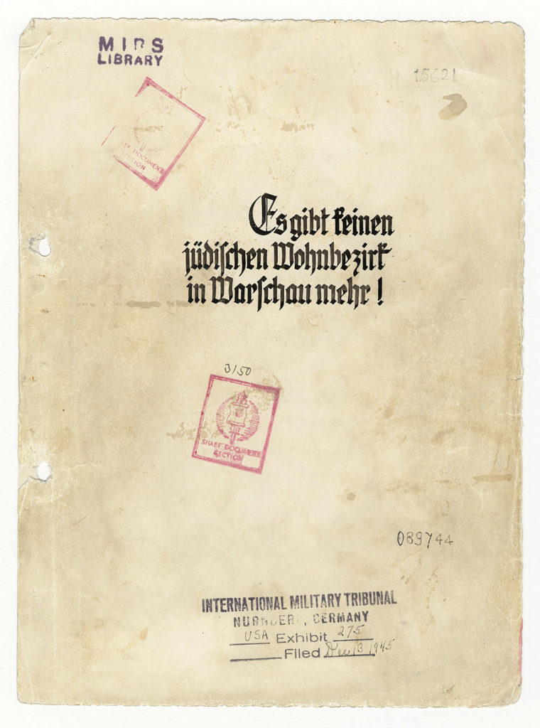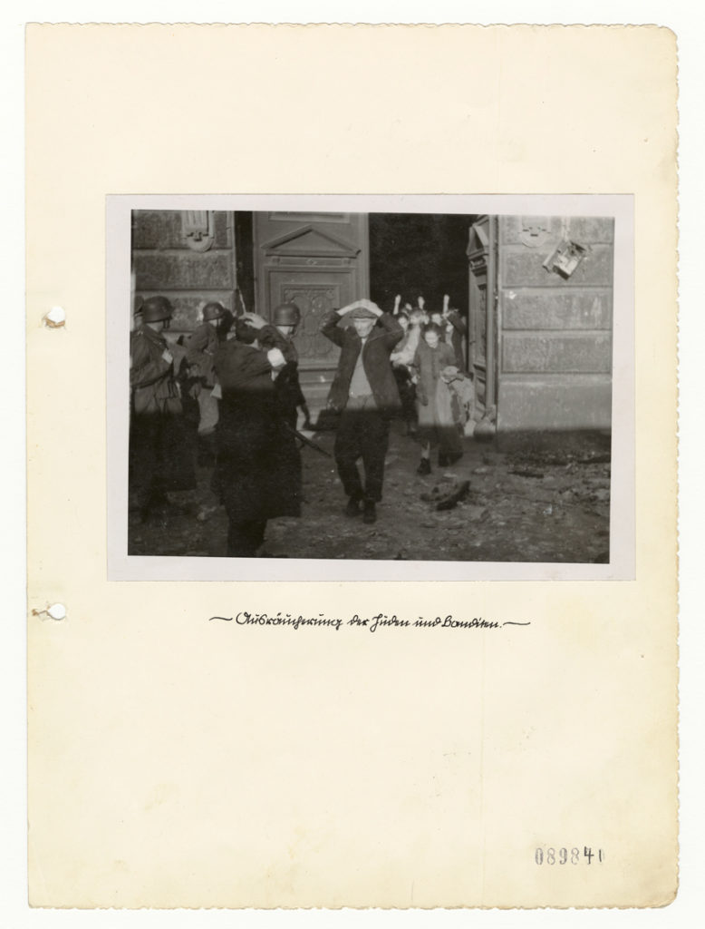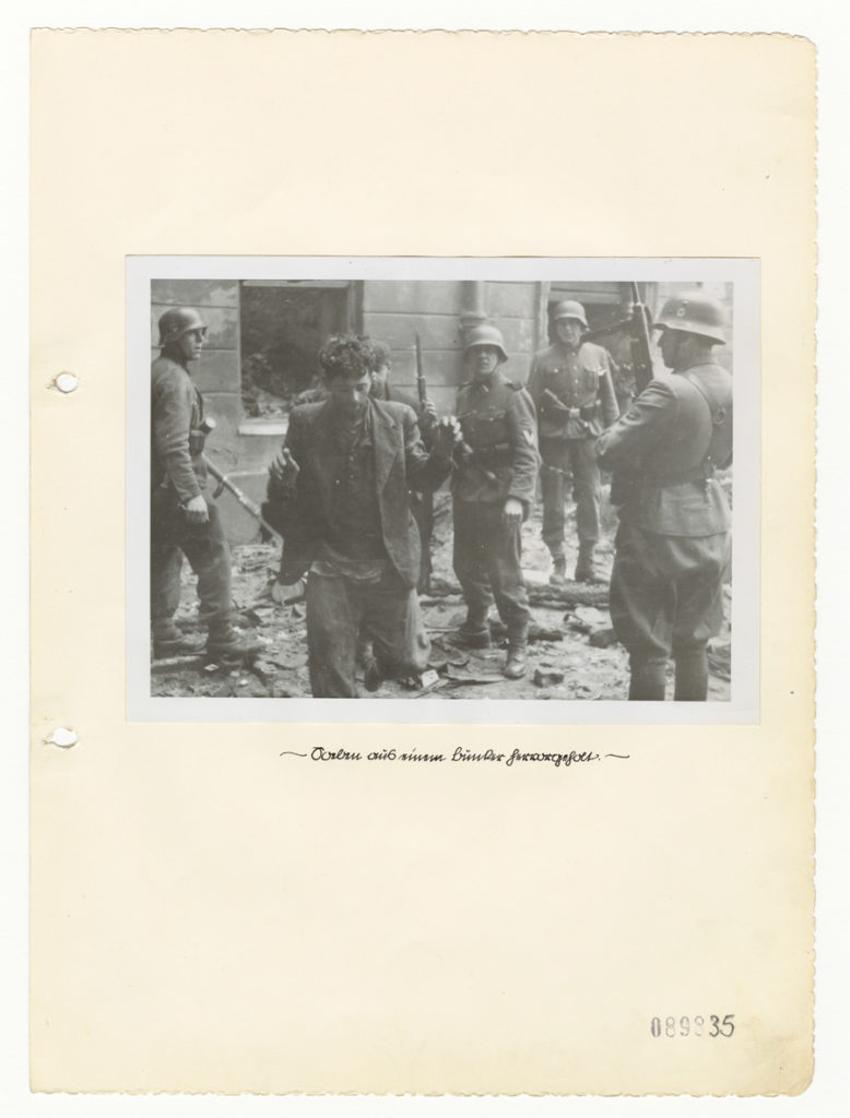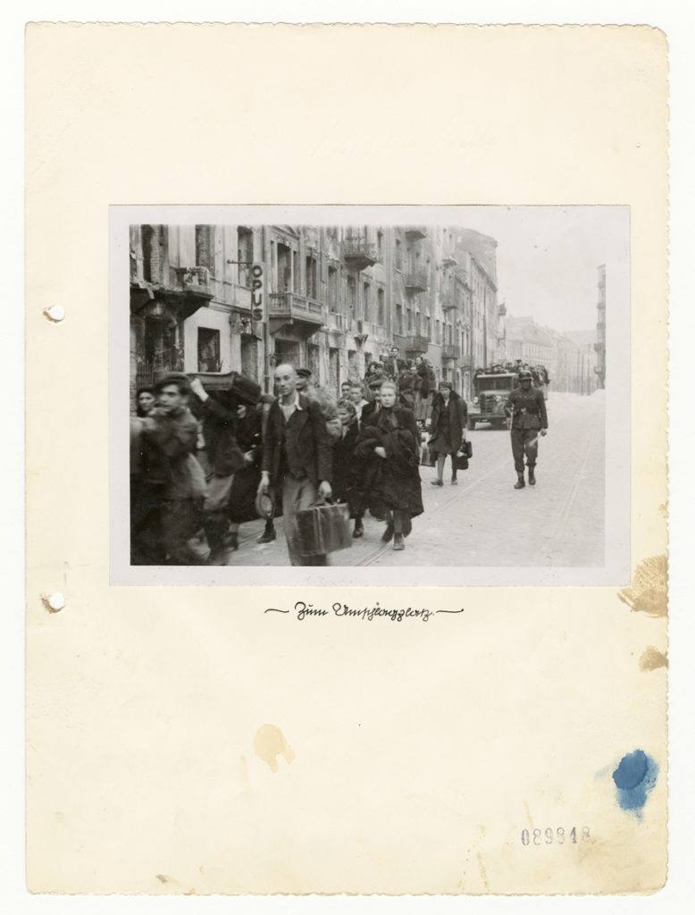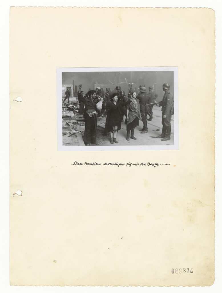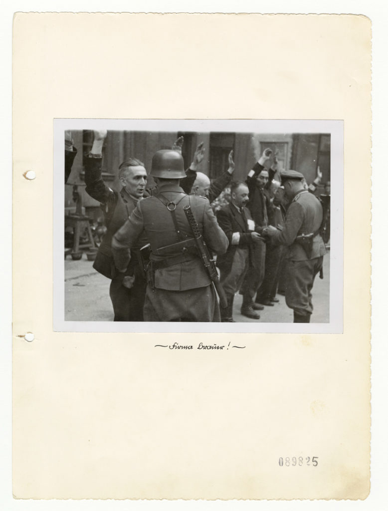 En mai 1943, le Waffen‐SS Jürgen Stroop, commandant des forces allemandes qui liquidèrent le ghetto de Varsovie, produit un rapport écrit de 75 pages titré "Il n'y a plus de quartier juif à Varsovie". Commandé par Friedrich‐Wilhelm Krüger, chef suprême de la SS et de la police en Pologne, et conçu comme un album‐souvenir pour Heinrich Himmler, ce rapport se compose de trois parties : un résumé des opérations menées par les SS, une collection de tous les communiqués quotidiens envoyés à Krüger, auxquels s’ajoute un « rapport photographique » d’une cinquantaine de pages comportant des dizaines de photos.