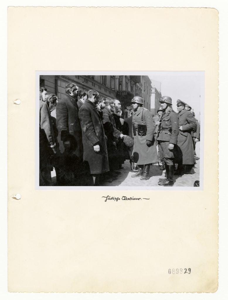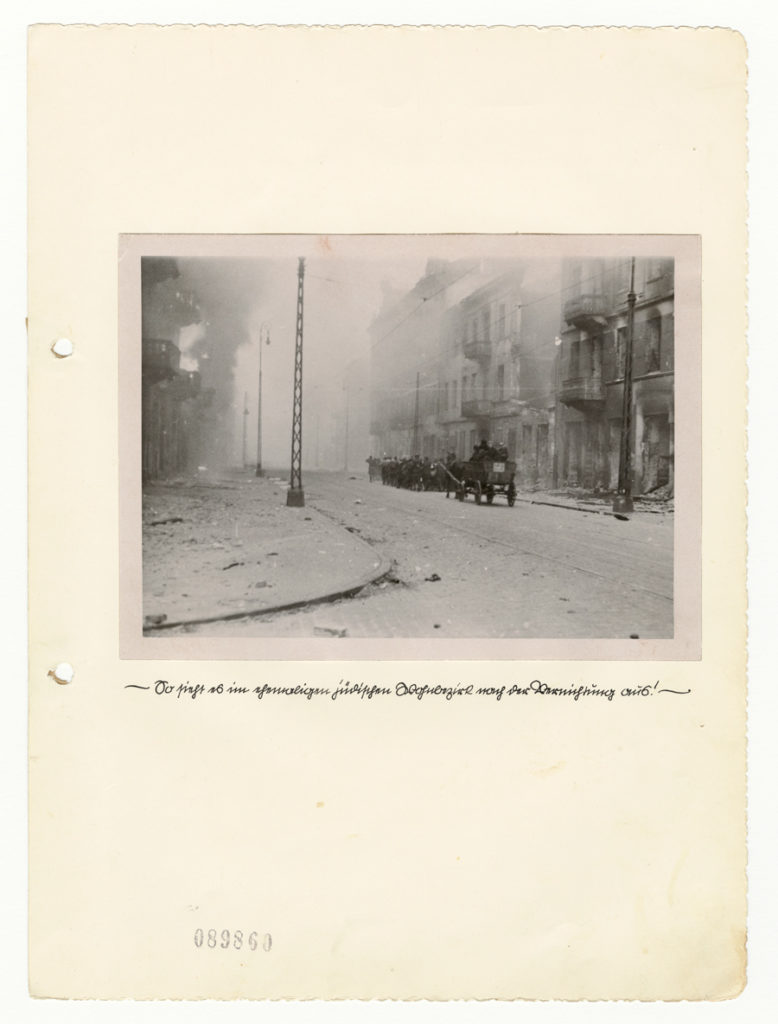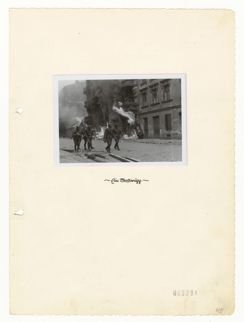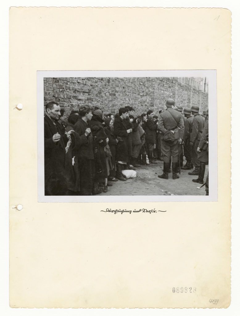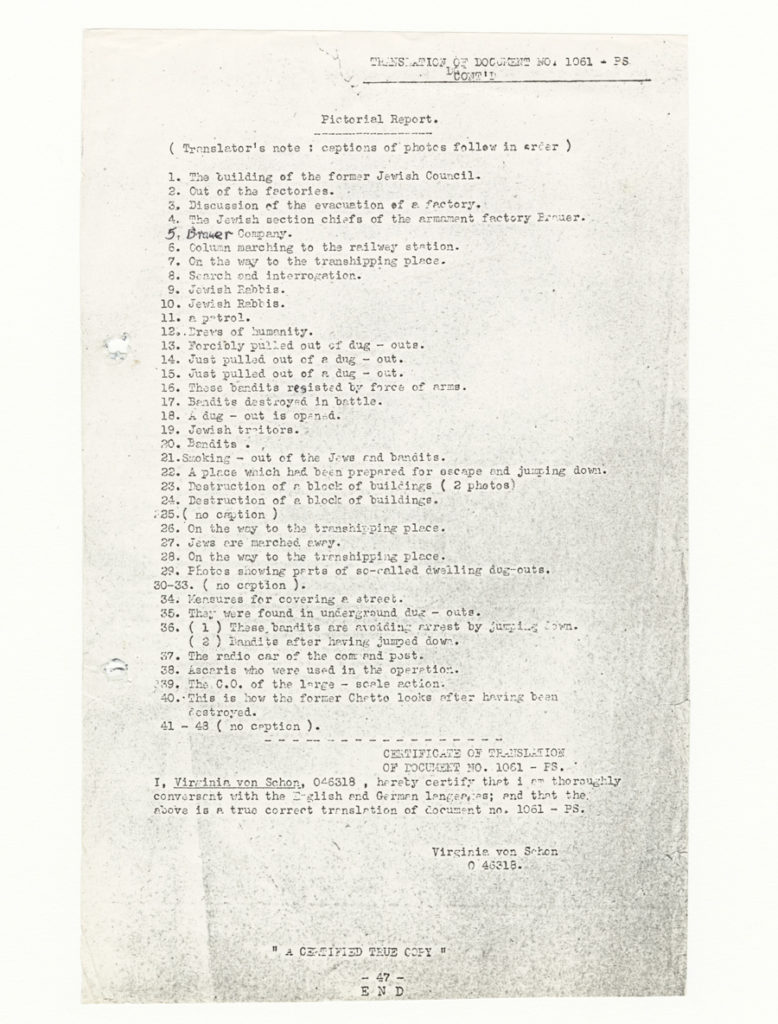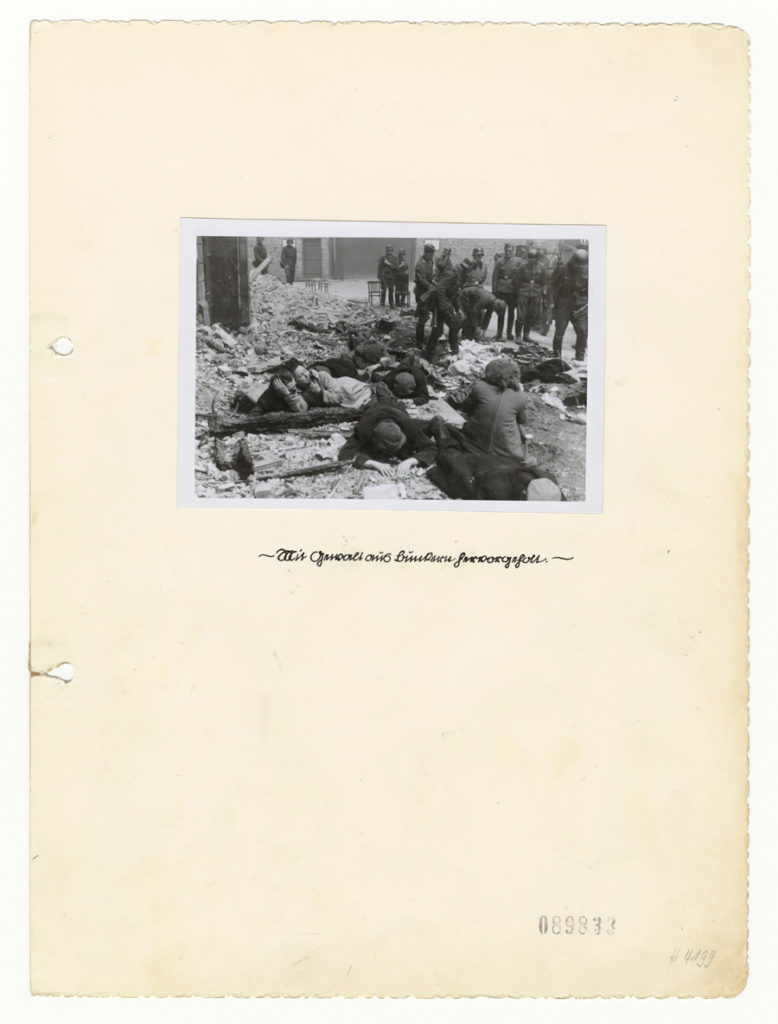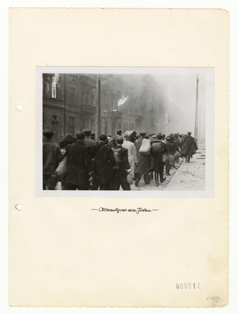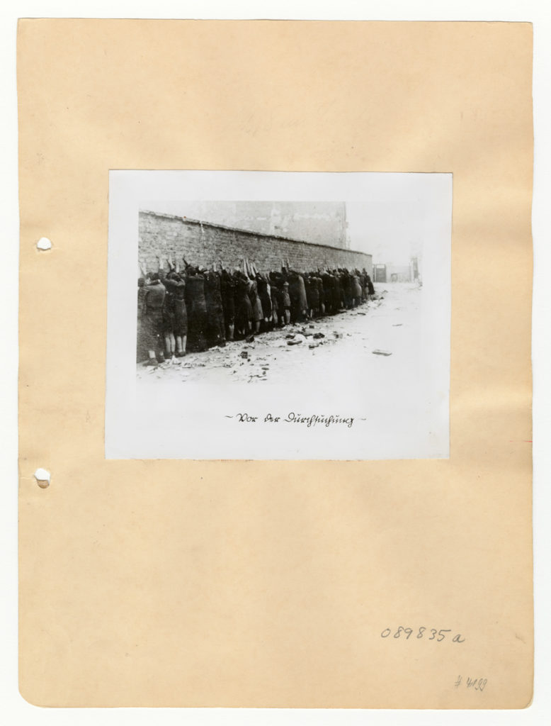 En mai 1943, le Waffen‐SS Jürgen Stroop, commandant des forces allemandes qui liquidèrent le ghetto de Varsovie, produit un rapport écrit de 75 pages titré "Il n'y a plus de quartier juif à Varsovie". Commandé par Friedrich‐Wilhelm Krüger, chef suprême de la SS et de la police en Pologne, et conçu comme un album‐souvenir pour Heinrich Himmler, ce rapport se compose de trois parties : un résumé des opérations menées par les SS, une collection de tous les communiqués quotidiens envoyés à Krüger, auxquels s’ajoute un « rapport photographique » d’une cinquantaine de pages comportant des dizaines de photos.