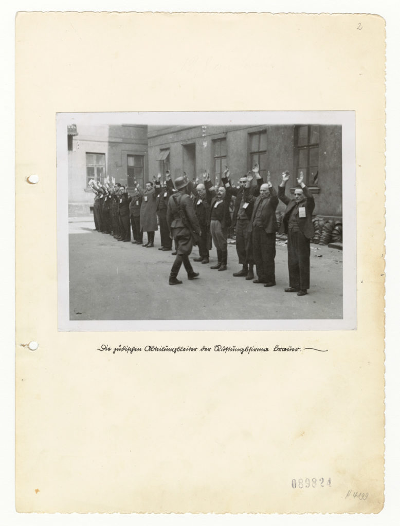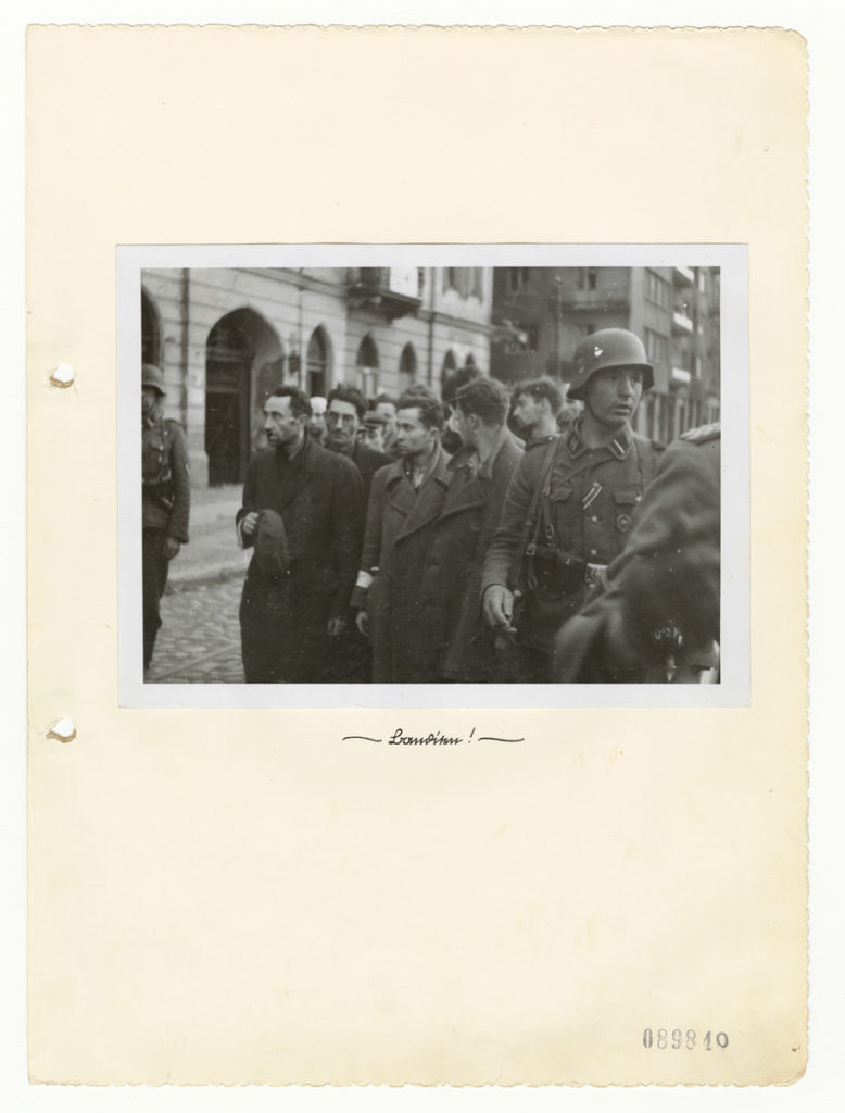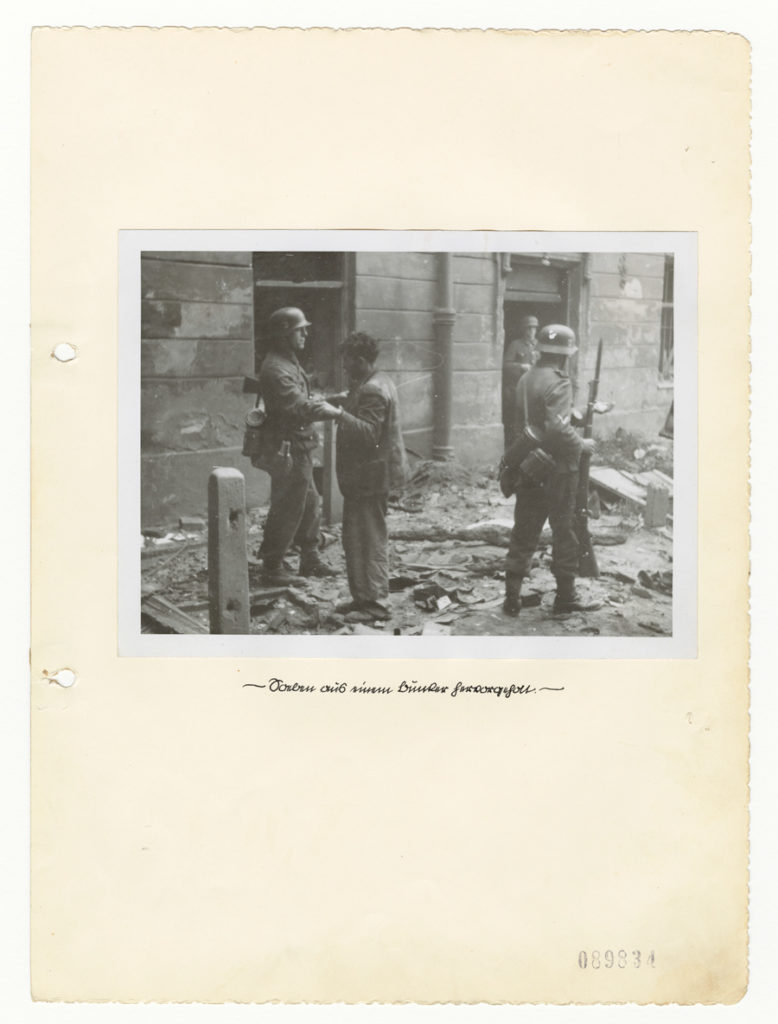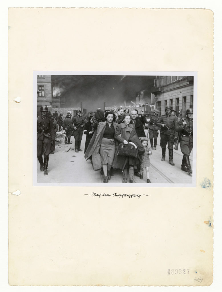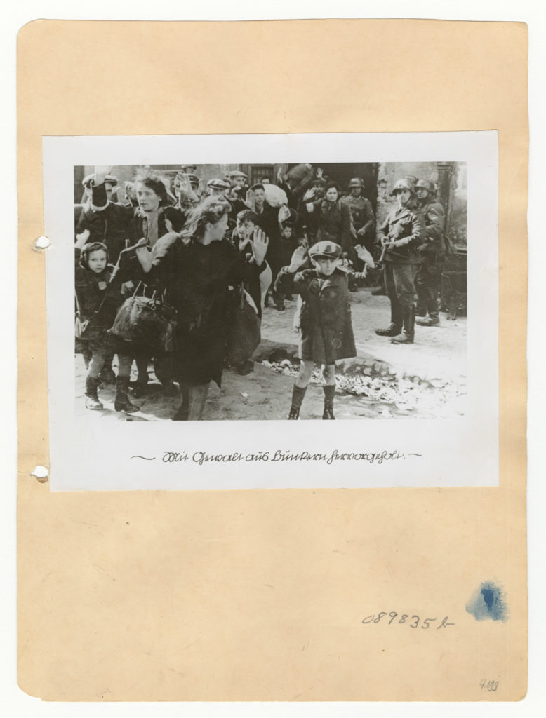 En mai 1943, le Waffen‐SS Jürgen Stroop produit un rapport dactylographié de 125 pages sur la liquidation du ghetto de Varsovie, destiné à être un « album‐souvenir » pour Heinrich Himmler. Ce document contient une cinquantaine de clichés photographiques pris par le service de propagande nazi. Le « rapport Stroop » a servi de preuve à charge lors du procès de Nuremberg. Parmi les clichés qui s’y trouvent : la photo devenue emblématique du « petit garçon de Varsovie », les bras levés.