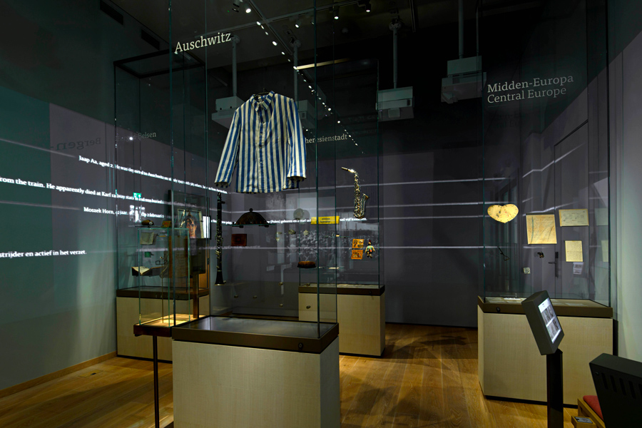 À l’intérieur du nouveau musée, le visiteur est frappé par deux choix muséologiques qui distinguent cette institution d’autres lieux de mémoire : des textes parcimonieux mais qui interpellent le public ; la quantité et la variété impressionnantes d’objets personnels qui montrent la vie de la communauté juive hollandaise avant, pendant et après la Shoah. Dans de petits films en noir et blanc, on sourit en voyant de nouveaux mariés s’embrasser ou une femme courant en maillot de bain sur la plage. Et on relie chaque destin individuel à l’histoire plus large d’une école, d’une ville, d’une communauté. Le baby‐foot qu’un garçon a confié à son copain pour qu’ils reprennent leurs parties "quand je reviendrai"; la jolie paire de gants qu’une fillette portait au mariage de sa sœur en juillet 1942 ; les marionnettes fabriquées par un père de famille à l’attention de ses deux jeunes fils qui seront assassinés. Plus de 400 objets, disposés dans 80 vitrines, donnent une dimension personnelle, humaine, émotionnelle au récit dont on connaît l’issue insupportable. La commissaire de l’exposition, Annemiek Gringold, et son équipe ne versent jamais dans le sentimentalisme et ne font pas l’économie des documents et images d’archives, même si certains peuvent choquer. On voit les exécutions de Juifs dans des tranchées, des scènes humiliantes à Westerbork et les visages creusés de personnes portant l’étoile jaune. Mais point de reconstitution, de wagon à bestiaux dans lequel on se serre ou de barbelé courant le long de la salle ; ce serait une distraction. La scénographie est sobre et claire, le propos est ancré dans le documenté, l’objet ou le document original. L’objectif de ce musée est avant tout pédagogique et il s’adresse aux jeunes générations, aux scolaires et aux personnes non‐juives. L’alternance heureuse entre les objets, les documents, les photos, les films et quelques œuvres d’art rendent la visite intéressante, jamais répétitive ou prévisible. Certaines salles sont un peu chargées, mais c’est l’étroitesse du bâtiment d’origine qui dicte les volumes à disposition.