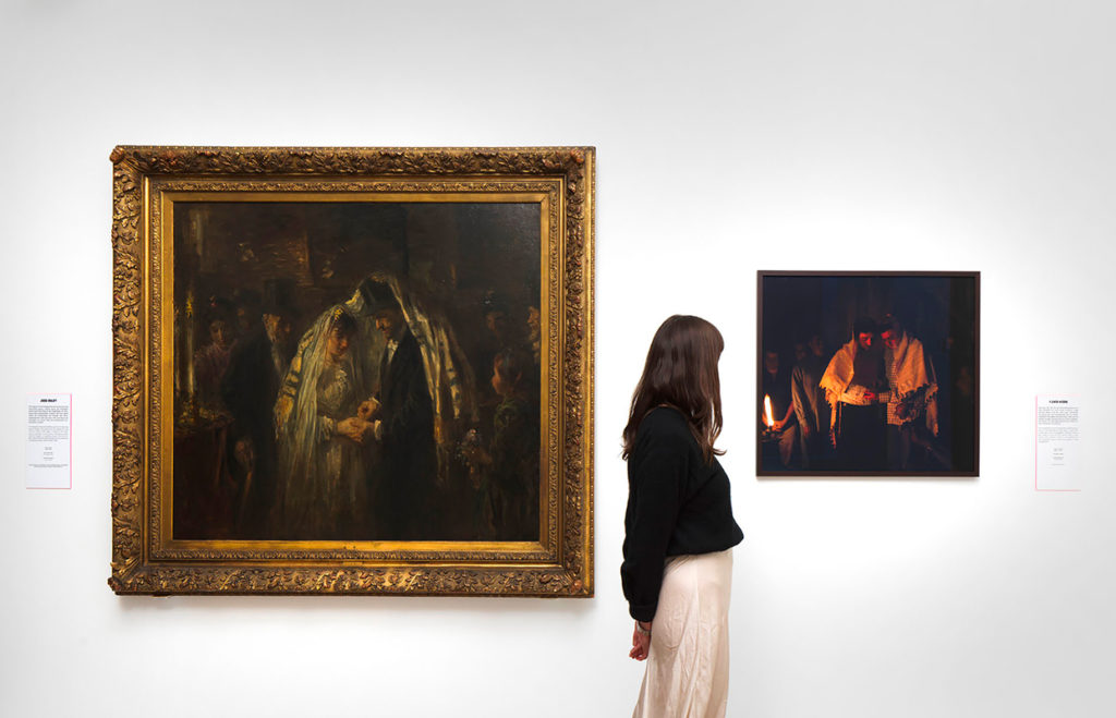 La cérémonie de mariage donne d’ailleurs lieu à une magnifique juxtaposition de tableaux : « Mariage juif », du peintre hollandais Jozef Israëls (1903) représente un couple sous un tallit ; l’homme, portant le haut‐de‐forme, glisse l’anneau à l’index de son épouse. À côté, la photographie « A Jewish Wedding », de Yitchak Woolf (2008) qui montre la cérémonie de mariage clairement inspirée du tableau de Jozef Israëls, mais qui représente cette fois, sous un même tallit, un homme, Benny, glissant l’anneau à l’index d’un autre homme, Nir.
