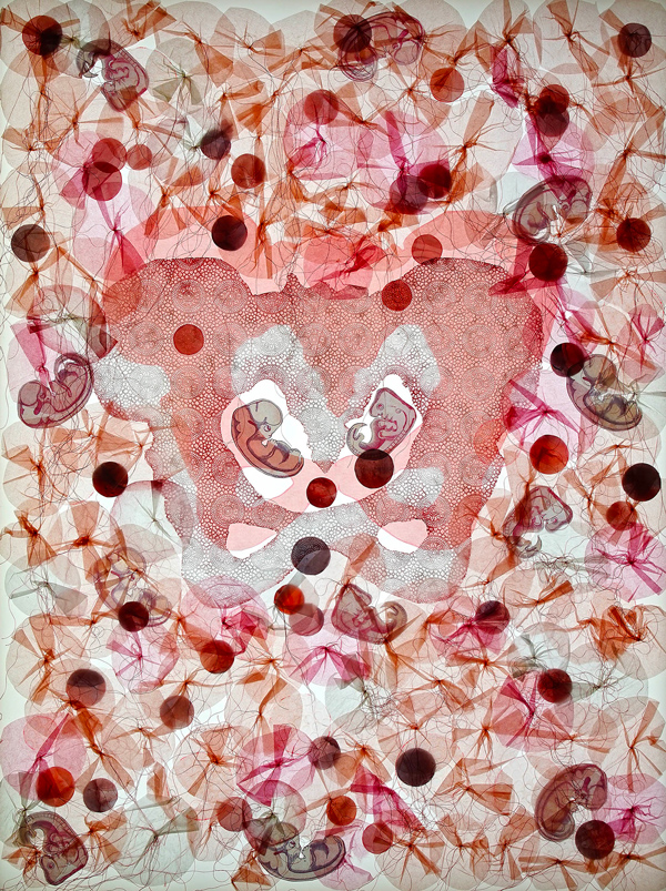 Dans la même section de l’exposition – même si les changements de thématique ne sont pas toujours clairs, contrairement au catalogue – il est aussi question des enfants, d’infertilité, de contraception et d’avortement : d’un côté les anneaux de Gräfenberg, un gynécologue juif allemand qui a donné son initiale au point G, zone érogène, et inventa, dans les années vingt, les premiers anneaux contraceptifs intra‐utérins ; de l’autre, l’artiste Andi LaVine Arnovitz qui s’intéresse aux problèmes d’infertilité et aux enfants pas encore nés dans un collage rose, rouge et blanc.