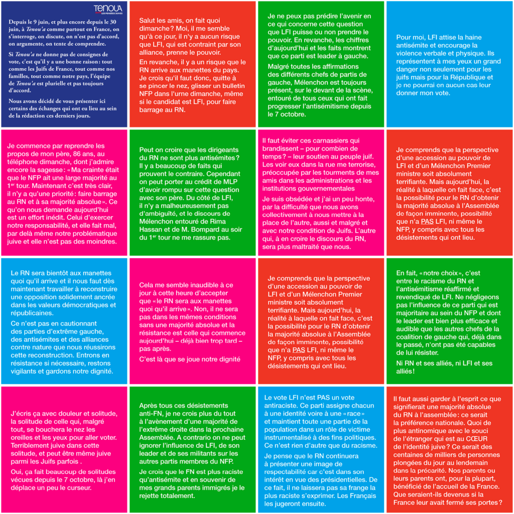 Si Tenou’a ne donne pas de consignes de vote, c’est qu’il y a une bonne raison : tout comme les Juifs de France, tout comme nos familles, tout comme notre pays, l’équipe de Tenou’a est plurielle et pas toujours d’accord.